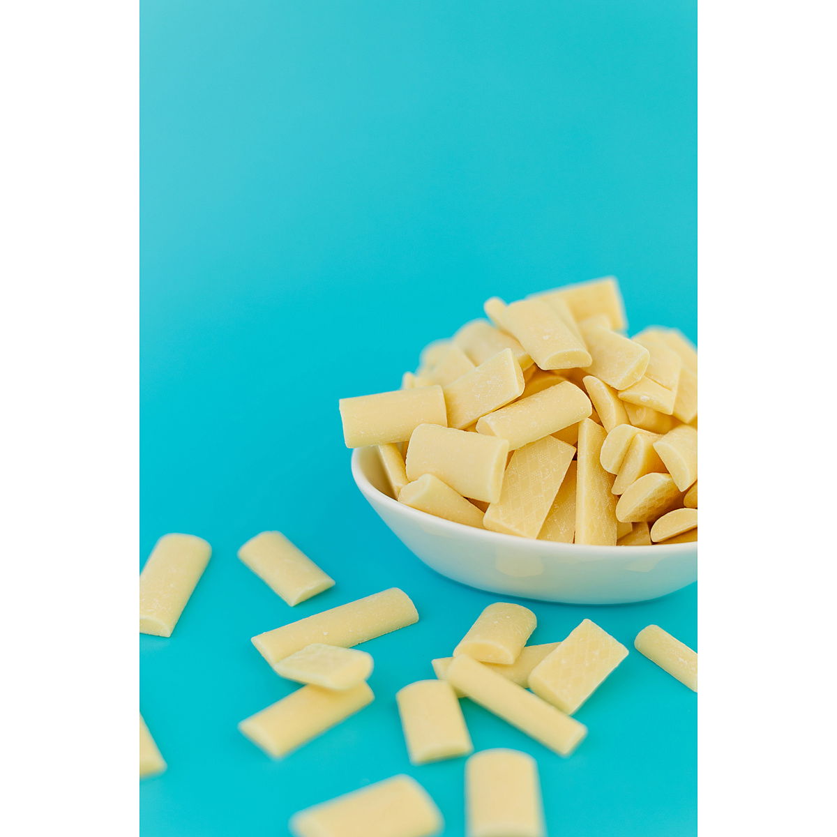 Bežné biele čokolády obsahujú približne 20 % kakaového masla, ale naša čokoláda obsahuje až 29 %. Vďaka tomu sa skvele rozpúšťa a je krásne jemná. Jej chuť je príjemne sladká a mliečna, farba smotanovo biela a každý kúsok vonia po vanilke.