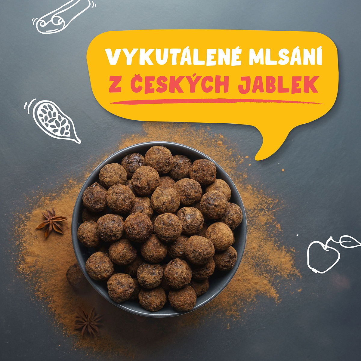 Malá desiata pre chvíle, kedy nestíhate, ale aj zdravé maškrtenie ku káve, keď si chcete užiť chvíľu pokoja. Guličky z českých sušených jabĺk a naklíčených ovsených vločiek ľahko zasýtia a vďaka ovocným sacharidom rýchlo doplnia chýbajúcu energiu. Vďaka tomu sa guličky prezývajú aj energy balls. Tenká vrstva čokolády zase zaženie chuť na sladké a škorica, v ktorej sa guličky na záver obaľujú, všetkému nasadzuje pomyselnú korunu. Podľahnite nestarnúcej kombinácií jabĺk a štipľavého korenia.