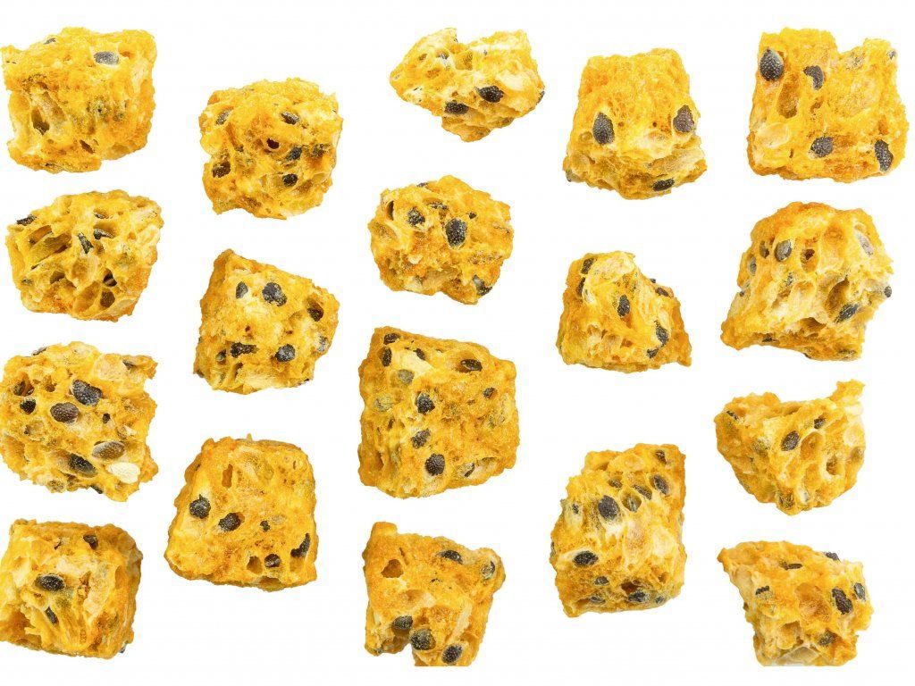 Marakuja, mučenka alebo passion fruit, môžete si vybrať, ktorý z názvov použijete. Pod všetkými sa ale skrýva tropické ovocie so šupkou vo fialovej alebo žltej farbe. Po rozkrojení sa objaví šťavnatá žltooranžová dužina s množstvom chrumkavých tmavých semienok. Túto dužinu sme pre vás usušili mrazom – zbavili ju vody, a docielili tak ešte intenzívnejšej chuti. Naše marakujové kocky sú výrazne kyslé, chrumkavé a majú sladkastú tropickú vôňu. Skúste si ich rozdrviť, pridať do tortového krému, smoothie alebo miešaného drinku, marakuja dodá jedlu či nápojom príjemnú sviežu vôňu a zvýrazní ich chuť. Vďaka tomu, že si zachovala krásny tvar i farbu čerstvého ovocia, ozdobí každú tortu, dezert alebo raňajky ako žiadne iné ovocie!