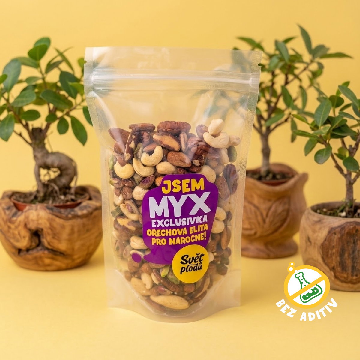 „Toto je MYX pre skutočných fajnšmekrov. Exclusivka obsahuje len tie najvyššie triedy akosti. Ide o starostlivý výber tých najlepších kúskov zo siedmich najunikátnejších druhov orechov. Vôňou, chuťou, chrumkavosťou aj veľkosťou sa im len máločo vyrovná. Ak chcete ochutnať to najlepšie z našej ponuky, tento MYX je selekciou tých najkrajších orechov, ktoré som kedy držal v ruke a mohol ochutnať.“